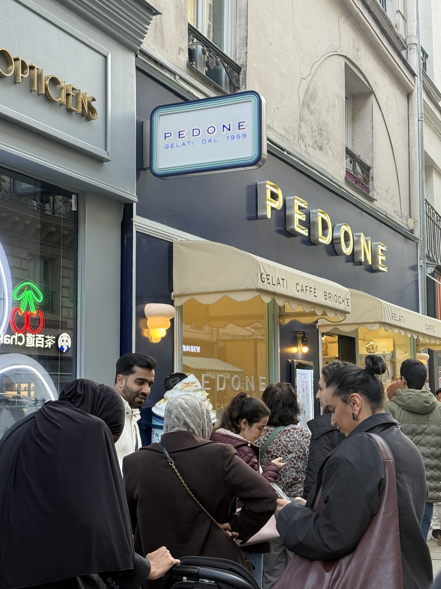 Last night we had dinner at a small bistro, Bistrot Richelieu, which was recommended by our hotel concierge. We sat outside and did some people watching while having a lovely dinner. At a nearby table, a mom and adult daughter on their first trip together were happy to meet us and chat with us. The mom is living in Florida and her daughter in Denver. What a lovely evening we had! They told us about a gelato place a couple of blocks away that had a long line so they thought it must be pretty good. After dinner we walked over and had to wait about 45 minutes to get in. It was worth it!