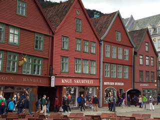 We toured the second largest city in Norway today, Bergen. There are 250,000 people living here and it is really like a living history museum. It is considered Norway’s most international city and most prices in the shops are shown in many currencies. When you sail into the harbor, there are houses on the hillsides, most with the distinctive red roofs.