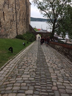 This picture of a cobblestone street on a hill leading to the fortress in Oslo (Akershus fortress) has different cobblestones in the middle.  This was to make it easier for the horses to climb and descend. I am not sure it does the same for people!