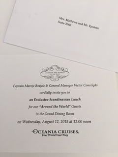 Today we were invited to a special Scandinavian lunch for world cruise travelers. Each table was hosted by a ship’s officer. We sat with one of the three first officers, Stephjan from Croatia and 3 other couples.  We learned a lot about the ship, for instance, the leftover food is ground up and emptied into the sea while we are moving – food for the sea life.  The first officers do a 4 hour day shift and a 4 hour night shift every day and they are on for 10 weeks. Stephjan has 2 young sons, 7 and 9, at home and although he loves his job and decided on it as a career at 14, he wouldn’t encourage his sons to do it.