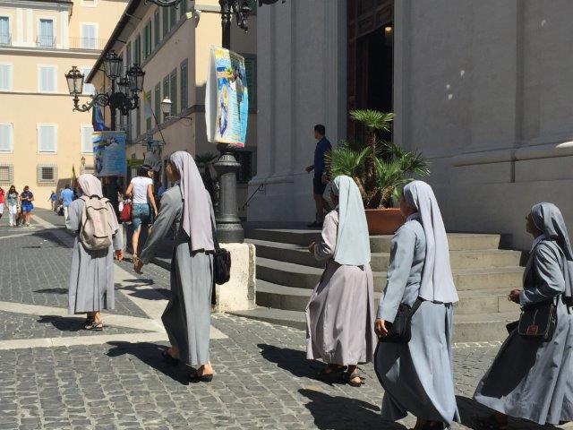 We then made our way to Castel Gandolfo, the village that is the summer residence of the Pope. Well, all except Francis, who doesn’t summer here. He comes about one day in July and one day in August and the people of the village are NOT happy about it. He apparently thinks it is for leisure and he doesn’t want to have that type of leisure time. There are large gardens that produce all of the vegetables for Vatican City, and the garden and papal summer home are all part of the sovereign Vatican State. When the Pope is there, the Swiss Guards are outside. It is a beautiful little village with 7500 population – overlooking a lake that was formed by a volcanic crater. We enjoyed a gelato there and visited some shops, took pictures. There was a mass going on in the church, so no picturesthere. But we saw some nuns walking around