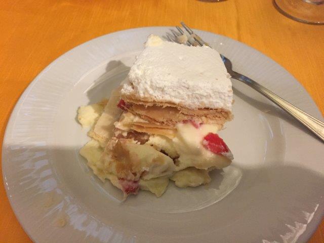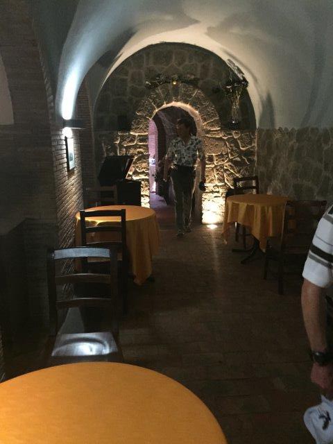 We enjoyed homemade bread with olive oil and local ham – a bruschetta – with white wine outside, then went in to the restaurant, which used to be a huge cistern. There we had salad, red wine, lasagne and gnocci with homemade tomato sauce, more delicious bread, and a lovely strawberry and cream dessert layered in phyllo dough.