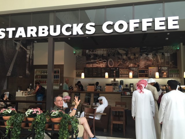 Today we took the shuttle bus to the city center which is 6 miles from the port. We spent the morning shopping and downloading stuff that takes too long on the ship.  The city center is much smaller than Dubai and Abu Dhabi, but the American stores and fast food are all there! As you can see, Norm had a coffee at Starbucks!