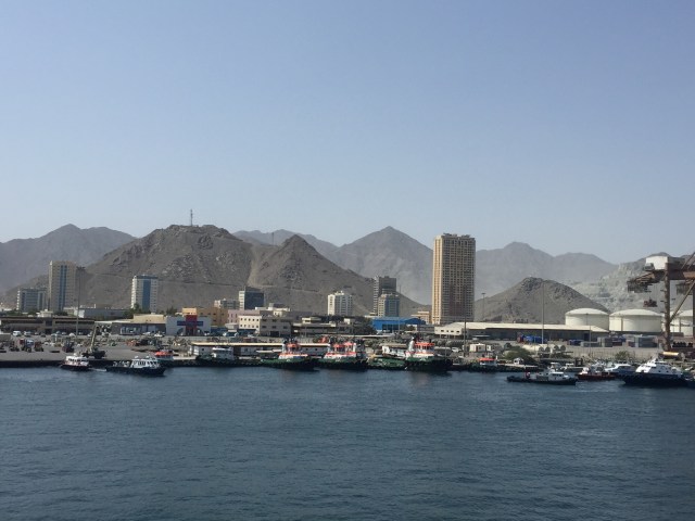 For a relatively small city, Fujairah has a busy port!. These small boats are out and back all day long.  This shot is from our balcony.
