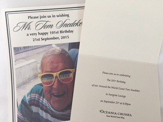 Speaking of age, today is Tom’s birthday (101) , and we got a party invitation for the world cruise travelers.