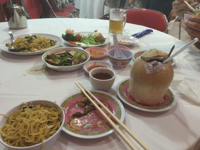 The dental office was near Chinatown, so we asked one of the staff members there for a recommendation for lunch. He recommended a restaurant on Mosque Street, Lee Kui, so we walked there and had all his recommendations for lunch, well, not the oyster omelet, but everything else!  Blaise duck, prawn roll, noodles and yam paste for dessert. Norm had a Tiger beer and I had coconut water. We were stuffed!