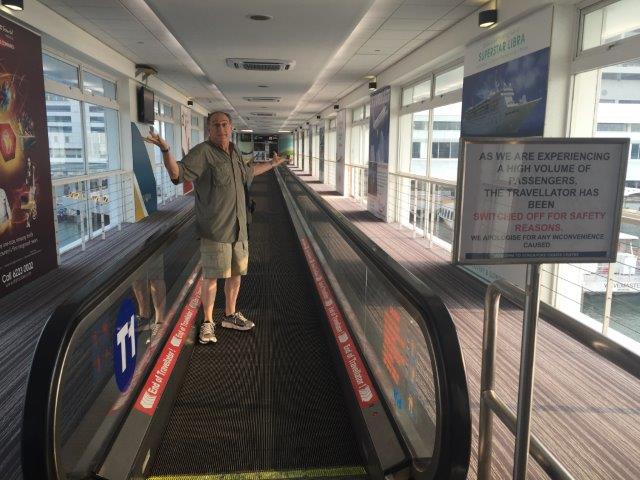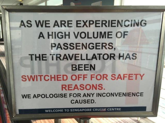 Curiously, both yesterday and today, the walkway into the cruise terminal had the moving walkway shut down “due to increased traffic”.  Wouldn’t you think that’s when they would want it ON?  And you can see there are really no crowds, we were the only people walking there this morning.