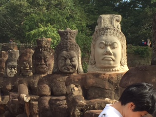 The smaller heads are the ones leading into the temple complex, on one side are 54 (5+4 = 9) demons, and on the other side are 54 gods.