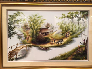 After lunch and unpacking, we went out to find a shop that we went to on our last visit here. Here, young women painstakingly hand embroider exquisite works of art. We were on a tour last time – to the actual workroom which had a shop – and we were too time constrained to make an intelligent choice. Ever since, Norm has been looking at the shop online – it is called XQ – but we didn’t want to buy online. We found the shop and after quite a while comparing many items, we purchased a Vietnamese scene. This picture doesn’t do it justice, it is simply beautiful.