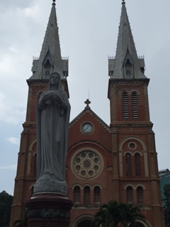 Since we had some time before we could board the ship, we went to the Notre Dame Cathedral, which was built during the time that the French were in control of Vietnam. 10% of the population is Catholic, 75% are Buddhist and the rest don’t practice any religion. The Cathedral is in the same square as the Central Post Office, one of the oldest buildings in the city. It was designed by the French architect Gustave Eiffel and the interiror has remained essentially untouched since its construction between 1886 and 1891.