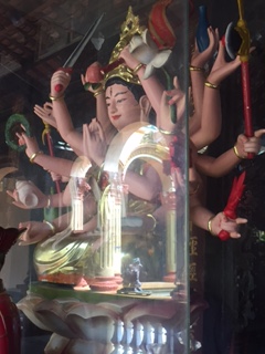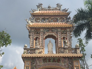 On the way to the port, we visited the 150 year old Vinh Trang Pagoda. It is a combination of Vietnamese Khmer and French architecture. There are three large Buddhas here, standing, sitting and lying.