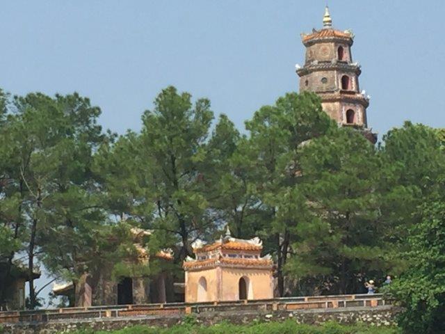 Before lunch, we went to the Thien Mu Pagoda, one of the most beautiful architectural structures in Vietnam. It has an octagonal seven-story tower and adjacent prayer hall perched on a hill overlooking the Perfume River. It is Buddhist design.