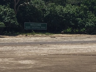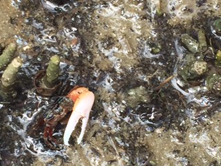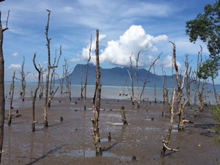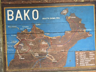 Our excursion today took us to Bako National Park in Kuching Malaysia. What a spectacular place! Mel was our guide. This was a trek into the jungle and the park is only accessible by boat, no roads lead into it. On the way we saw houses on stilts, many shrimp traps (they like to feed in the mangroves) and people in fishing boats. Bako is the oldest park in Sarawak, and the word means mangrove.. We boarded the boat in the fishing village of Bako and cruised in the river to the South China Sea and to the park. There are 7 different ecosystems within the park and the trek was challenging and fun. We saw the proboscis monkey, another type of monkey, small crabs, a green viper, many wild boars and a lemur (which looks like a flying rabbit). They are nocturnal and it was hanging from a tree, sleeping. The monkey and lemur pictures showed too much greenery to spot the animals so I am not including them here.