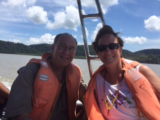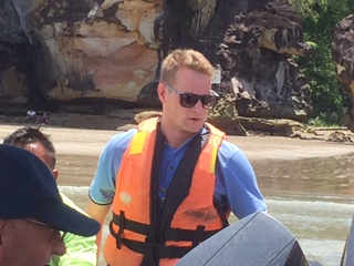 Then we returned to the boat, we walked along the beach when it was low tide. This required a “wet” embarkment to the small boats, wading through knee high water. Once we got into the boat, it was stuck on the sand, so a couple of travelers had to get out and help push it free. Here is Luke, from the Oceania entertainment team, helping with the pushing!