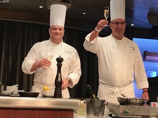 We happen to have 2 executive chefs on the ship right now, which rarely happens. The French chef, Farid Oudir, will be leaving tomorrow and returning in March. Jorg Becker, the German chef, is here early to replace him. So today we got to see a cooking demonstration with both of them. Very funny as always. Jorg drinks a whole bottle of champagne during the demo. His saying is “how can you drink all day if you don’t start in the morning!?” Somehow he juggles plates and does a great job with the demo, but as you can see, he has the physique to pull it off. We got to taste the Wiener Schnitzel and his grandmother’s potato salad, made by Jorg, and pork medallions, mushrooms favour and sauteed apple flame made by Farid. Delicious.