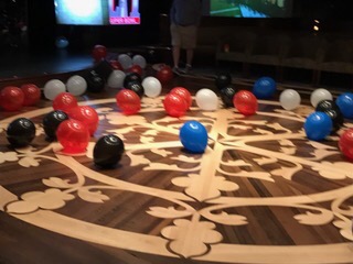 After a great morning, we returned to the ship for the super bowl party. No commercials are shown here but the game is on the 3 big screens in the theater. One side of the entrance is decorated with New England colors and the other side with Atlanta colors. We apparently will see Lady Gaga and the halftime show.