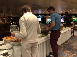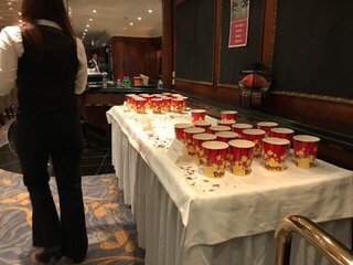 After a great morning, we returned to the ship for the super bowl party. No commercials are shown here but the game is on the 3 big screens in the theater. One side of the entrance is decorated with New England colors and the other side with Atlanta colors. We apparently will see Lady Gaga and the halftime show.