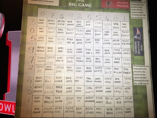 The betting pool boards are also up in the front between the screens. Almost 200 spots were sold so we will see if we win anything. They have popcorn, hot dogs, hamburgers, guacamole, salsa and chips and much more. A large variety of drinks accompanies the football food. As you can tell, I am writing this while watching the game. It is almost the end of the first quarter.
