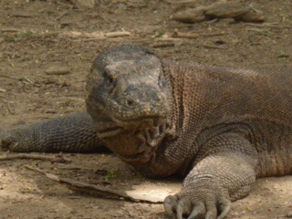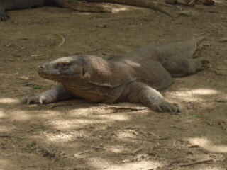 The dragons are extremely strong, with huge hooked claws and a forked tongue that they use in much the same manner as a snake. Their saliva is full of bacteria that will kill a human or any of their prey in a very short time. They are fast on land and can swim and climb trees. They eat the wild pigs and Timor deer that are found on the island. They are very territorial and will even eat each other if they cross into another’s territory. The guides have these long forked sticks that they carry. We sure hoped that would hold any hungry dragons at bay, but they really didn’t seem that interested in us.