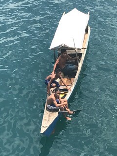 As we were waiting for the ship to be cleared, we were out on deck 5 and there were many children in small boats coming up near the ship and shouting “money”. Some passengers threw dollar bills down and the children would dive for them. In spite of being repeatedly warned by Leslie not to do so because of the danger of being so close to an anchored ship which does move, people did it anyway. Once on the island, the guides also asked us please to not give money to the children as it encourages the behavior that the native people are not proud of. I would rather buy something from them.