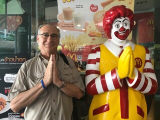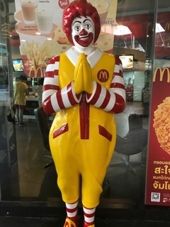I did a little shopping in a wonderful Thai shop and on our way back out to the cab (he returned to pick us up), we spotted what many tour guides refer to as “the American Embassy”, McDonalds. But Ronald looked different here.