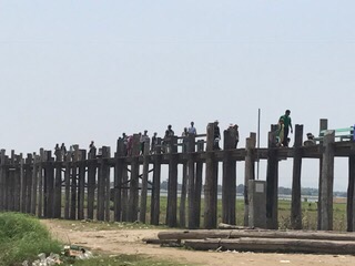 Our flight was on time and we arrived in Mandalay about 10 AM. Our first stop was in Amarapura, Myanmar’s penultimate Royal Capital. We visited the U Bein Bridge which spans Taungthamen Lake and is the longest teak footbridge in the world. There were lots of people walking across it and it was quite a sight. The waters here are full of the nasty water hyacinth which really clogs the waterways and is hard to get rid of. We saw a number of people begging on the bridge. One of the saddest sights was this little girl holding an infant.