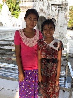 Most of the women and some of the men are completely covered to protect them from the sun as we have seen in other countries. Here, though, they use a root called Thanaka on their faces and sometimes on their bodies, to protect them from the sun. Some women have it applied in lovely ways but mostly it looks like a chalky circle. These girls have leaf shapes on their cheeks. Moh Moh is showing us the root that is used.