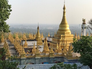 10 people from the ship were in the group going to Mandalay. On our last cruise we went to Bagan. This time there were 40 people going there so we felt lucky to have such a small group.We were met bright and early by our guide, Moh Moh. The trip to the Yangon airport took 90 minutes and Moh Moh gave us some information about Myanmar, formerly Burma. This is primarily a Buddhist country and all males are required to spend some time in a monastery. It can be as little as a week, but most stay longer. People who are very poor often send their children to live there and many of these children become monks. All of the food is donated to the monks – they go door to door every day -and they are only allowed breakfast and lunch, no food after 12 noon.