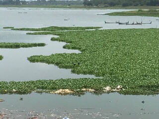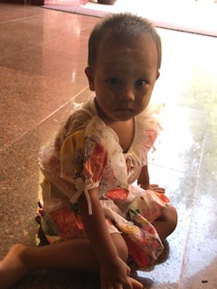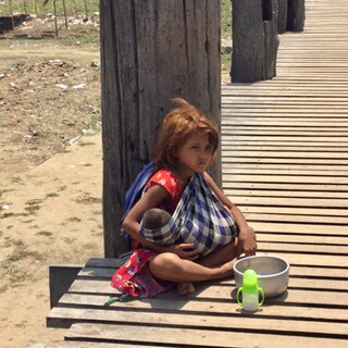 Our flight was on time and we arrived in Mandalay about 10 AM. Our first stop was in Amarapura, Myanmar’s penultimate Royal Capital. We visited the U Bein Bridge which spans Taungthamen Lake and is the longest teak footbridge in the world. There were lots of people walking across it and it was quite a sight. The waters here are full of the nasty water hyacinth which really clogs the waterways and is hard to get rid of. We saw a number of people begging on the bridge. One of the saddest sights was this little girl holding an infant.