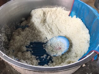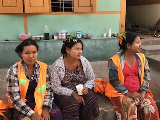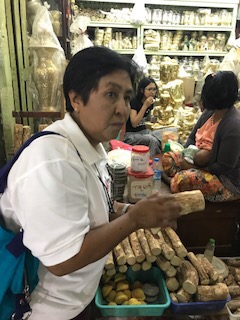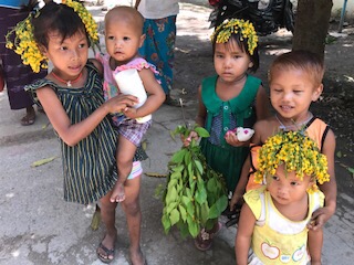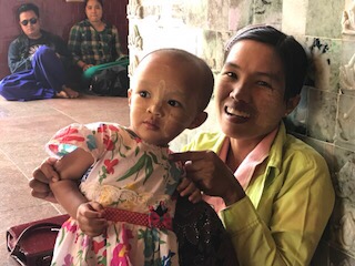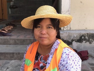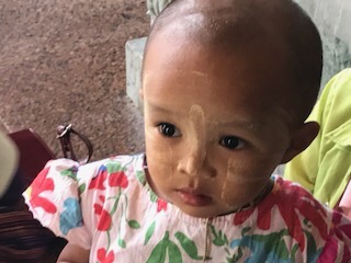 Most of the women and some of the men are completely covered to protect them from the sun as we have seen in other countries. Here, though, they use a root called Thanaka on their faces and sometimes on their bodies, to protect them from the sun. Some women have it applied in lovely ways but mostly it looks like a chalky circle. These girls have leaf shapes on their cheeks. Moh Moh is showing us the root that is used.