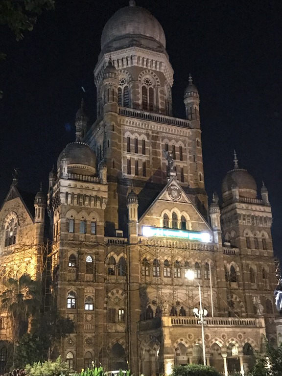 We returned to the ship to cool off, shower and dress for our evening excursion, Bombay by lights. When the sun goes down and the lights come on, Mumbai becomes quite an entertainment center.  Our guide was Maleini.  She pointed out many landmarks which are beautifully lit up at night. We traveled past the Taj Mahal Palace hotel, the Gateway to India, the Victoria Terminus train station and the Art Deco Marine Drive, referred to the Queen’s Necklace at night due to the vision it creates with the curved shape of the bay being accented by thousands of sparkling lights.  There were many people on the beach and Maleini said they mostly go at night, never dress in bathing suits or swim and completely cover up in the day since they think their skin is brown enough and they don’t want to be exposed to the sun.
