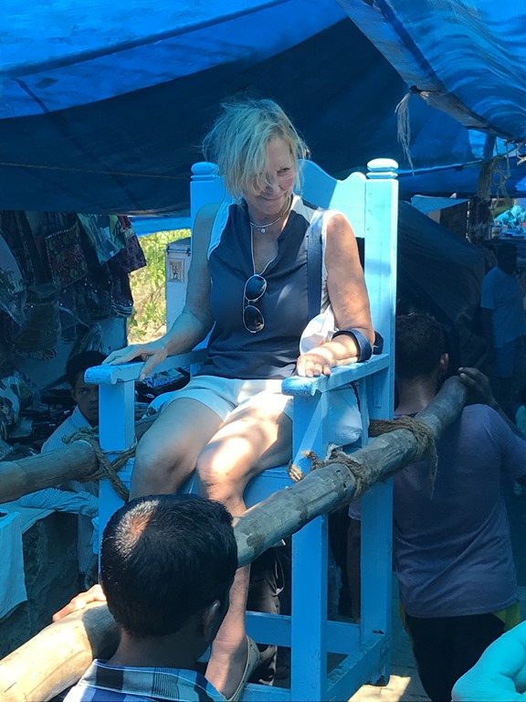 The island resembles twin hillocks rising from the sea with the caves located halfway up the higher of the two.  There are 120 steps to climb.  For $30 (plus tip) you could ride in one of these chairs with four men carrying you.  Not for us, but some people took advantage of it.