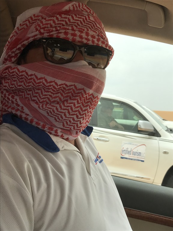 We stopped for a break before our guides let some of the air out of the tires in preparation for the dune adventure.  Sand was blowing already so now we know why the headresses are worn!