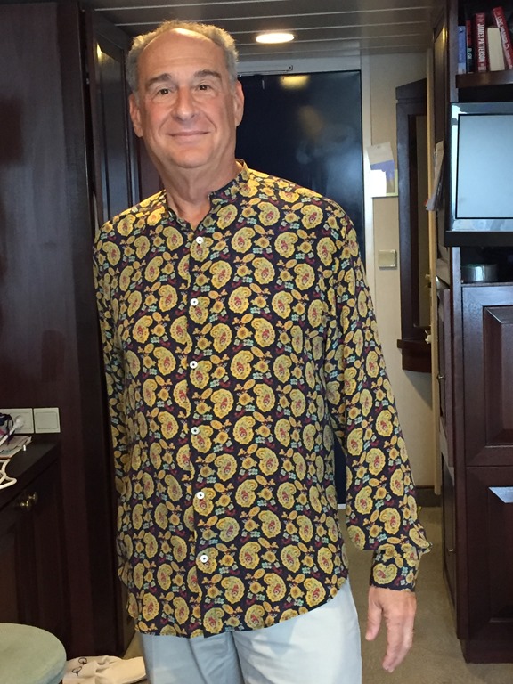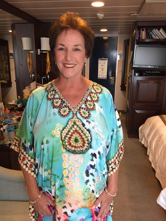 I wore my new silk caftan that I bought in the Taj Mahal Palace Hotel in Mumbai and Norm wore the shirt that he bought there.