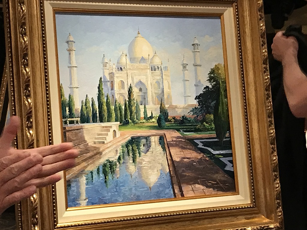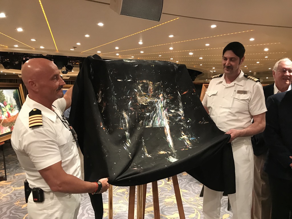 Last night, Graham Denison, our artist, held his last cocktail party and he unveiled his latest painting. the Taj Mahal. He does all of his painting with a pallet knife and they are amazing. Our Captain Maroje and our Chief Engineer Nedyalko are doing the unveiling.