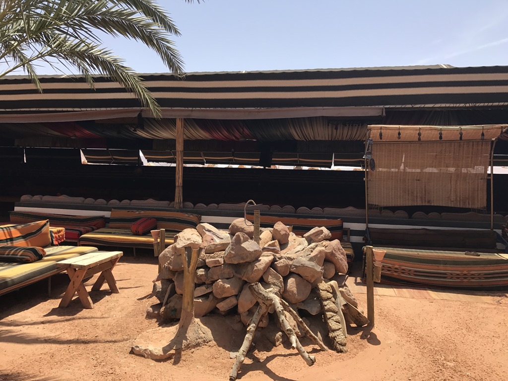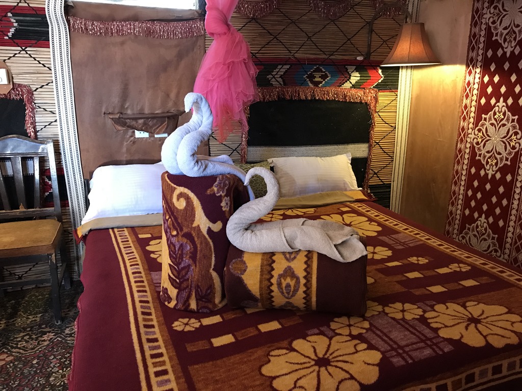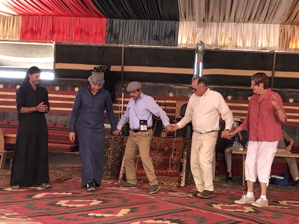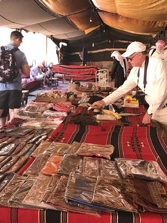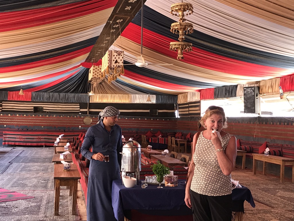 Our last stop was at a Bedouin camp that also serves as a hotel. We had more tea with dates and sesame cookies in the main gathering area, and Mohammed led some of us in Arabic dancing. Then, they let us see the rooms. One type is smaller with no air conditioning and the other is larger and does have AC. I know which one we would opt for!