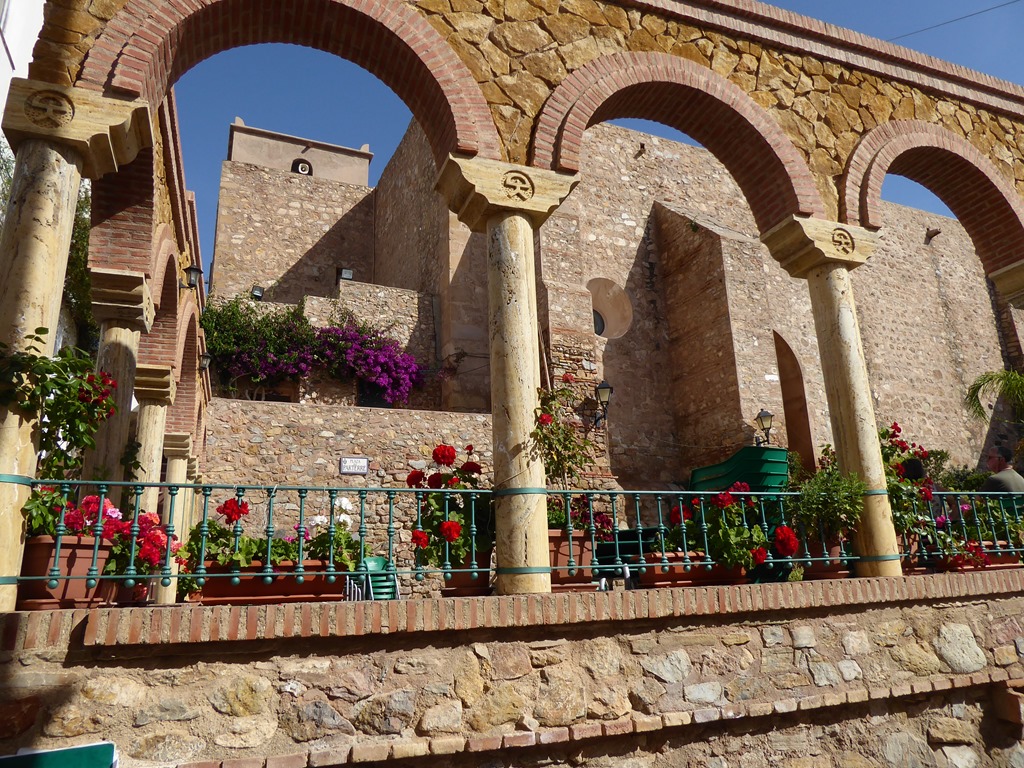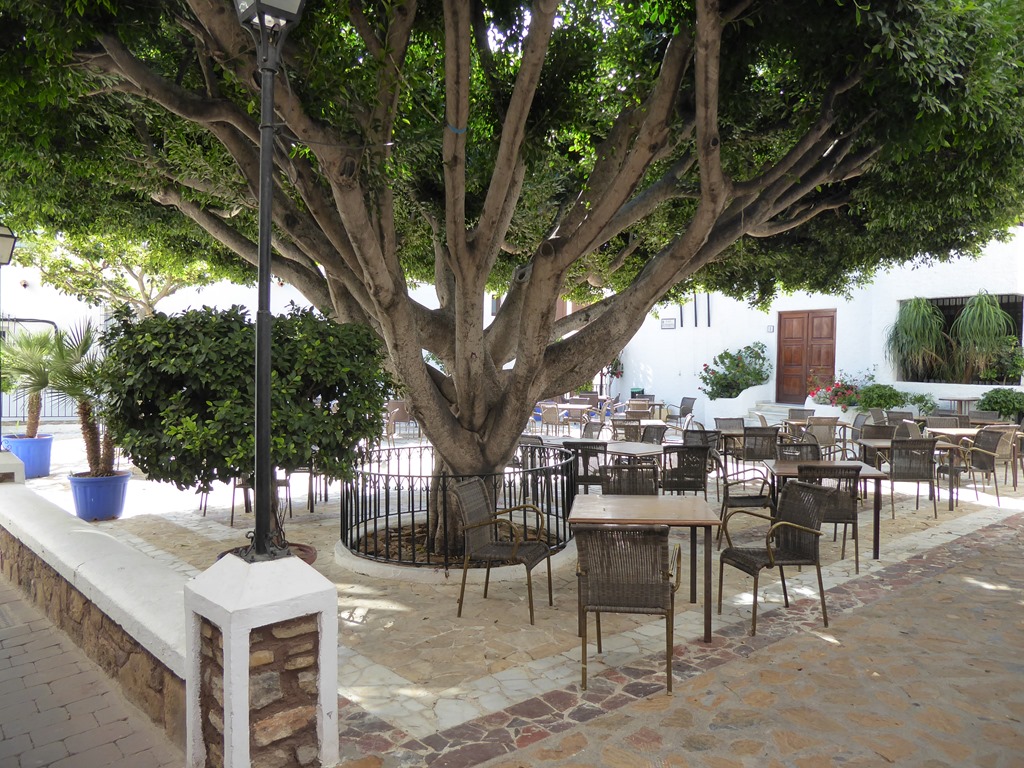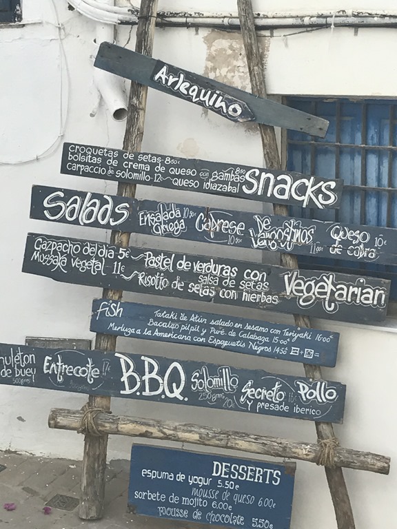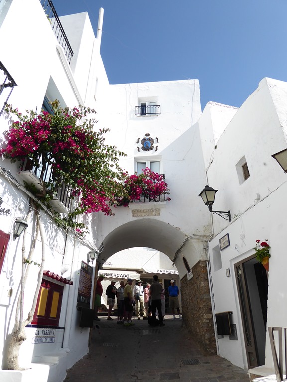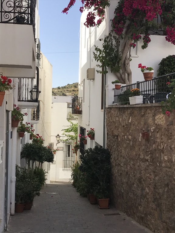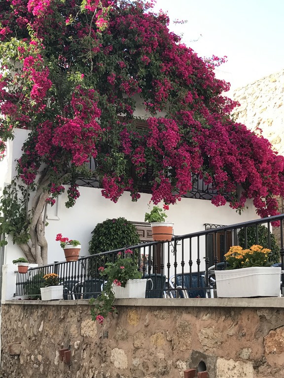 Mojacar is a beautiful town.  The Phoenicians, Carthaginians, Romans, Greeks and Moors have all lived here.  The buildings are clustered almost atop each other and are uniformly whitewashed.  They have flat roofs with collection systems for the rainwater. Many are designed with an Arab flair, and Emelio told us that the narrow passageways were specifically designed to allow people to be in shade most of the time to stay cool. Emelio guided us through the narrow intertwined streets before giving us free time to explore.  The shops were wonderful and the prices very good.  But the scenery was really amazing.