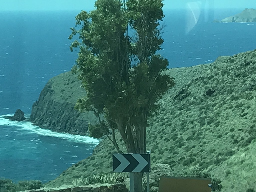 We wished we had even more time there, but we were off to our next destination – a drive through the Cabo Gata-Njar, a 175 square mile nature reserve that extends to the sea.  It was volcanically formed and has jagged sea cliffs, sand dunes and both wetlands and large stretches of arid terrain.  Emelio stressed that it is not a “national park” but a “natural park” which means that if people buy land with ruins on it, they can build a house (but they cannot take away the ruins.) Here is an example: