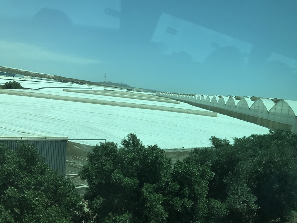 The province of Almeria is a strange corner of Spain.  Inland, it has an almost lunar landscape of desert, sandstone cones and dried up riverbeds.  On our trip today we saw the greenhouses, spreading almost 50,000 acres and as our guide said, visible from space and one of the world’s largest greenhouse complexes. Much of the new wealth of the area is due to the production from the many greenhouses.  Scientists are studying the effects of these greenhouses on the climate.  It is considered the “garden of Europe” in the middle of the desert.  Many crops including cucumbers, watermelons, squash,  grapes and tomatoes are grown here in an organic and pesticide free environment.