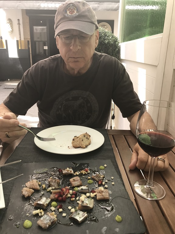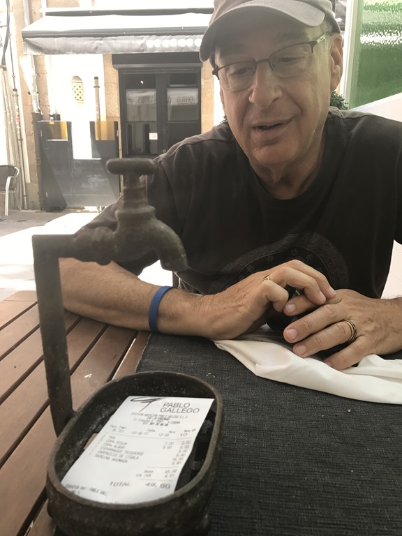 A bit more strolling through the old streets and into the shops (which didn’t open until 11 today – Saturday) and then we had lunch at what is said to be one of the best restaurants here. They are known for sardines and octopus. Well, Norm had his sardines, and we had delicious wine and bread, lobster carpaccio, asparagus with parmesan and local olive oil. And look at how they presented the bill!