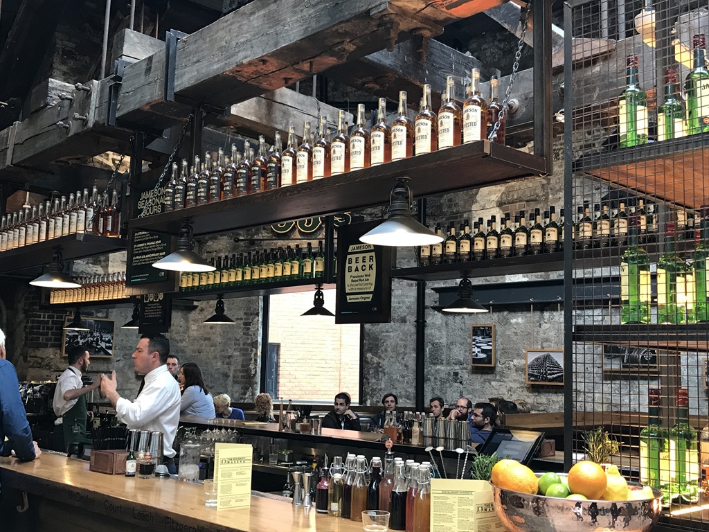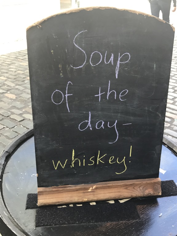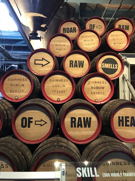 We then moved on to the Jameson Distillery on Bow Street. Here we had a guided tour of the triple distilling that makes Jameson so smooth. We learned about the origins and process, had a tasting comparing three kinds of whiskey – first, without knowing what they were. The first was the Jameson, the second was Scotch – we later found out it was Johnny Walker Black, and the third was Jack Daniels. The purpose was not to say that one is better than the other, but simply to point out the differences in taste. After the tour, we had complimentary drinks. I took my Jameson with ginger ale and lime. Pretty good for someone who never drinks whiskey!