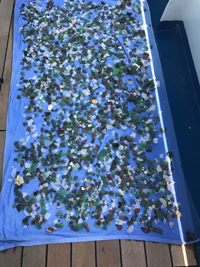 Saturday we had a mission- sea glass. Took a long walk and encountered several bad direction givers on our way to Buildings Bay. Finally one nice guy gave us a ride. Tiny secluded beach but what a treasure trove of glass! And sea creatures on the rocks. Had a nice swim before walking back.