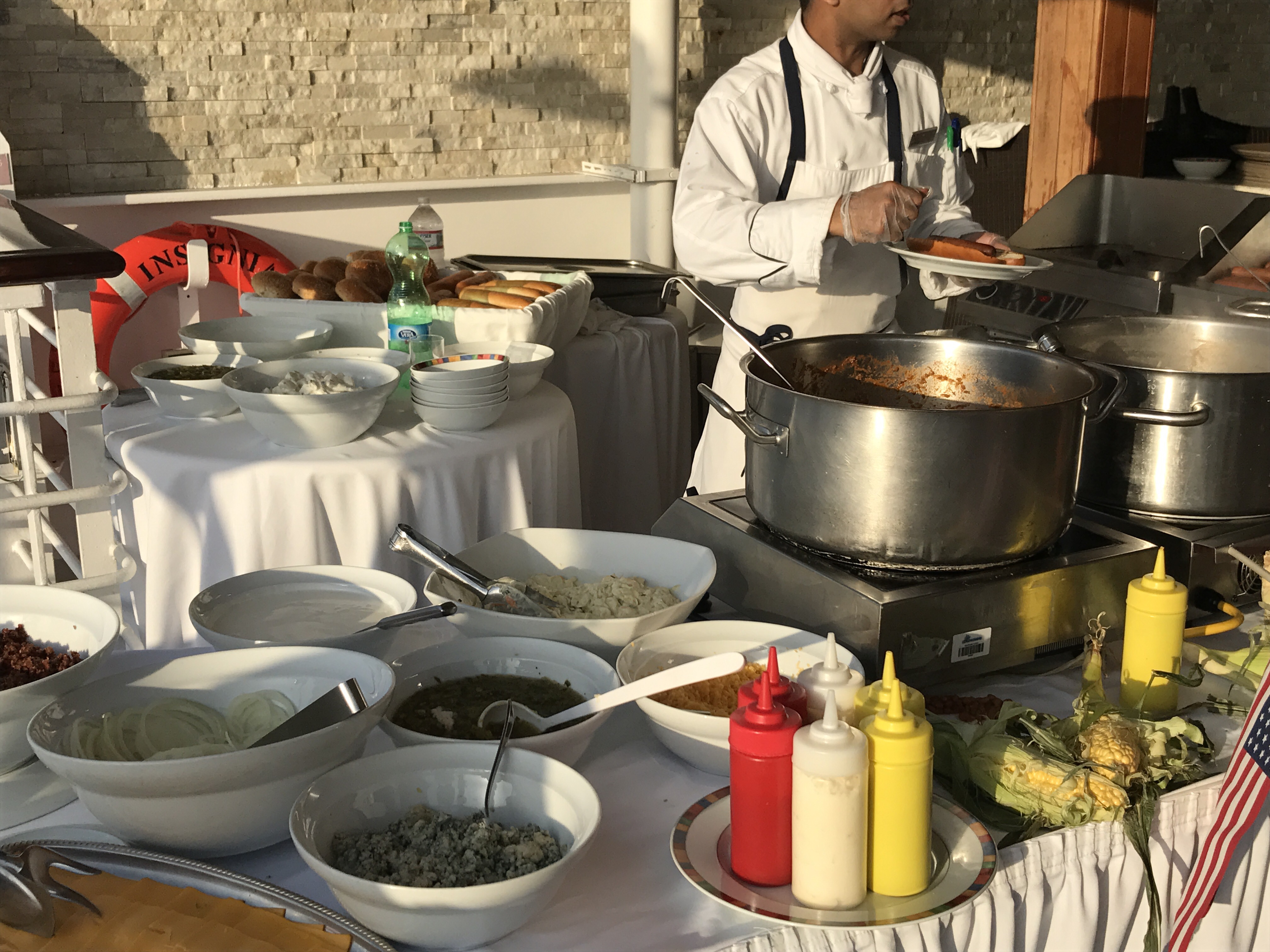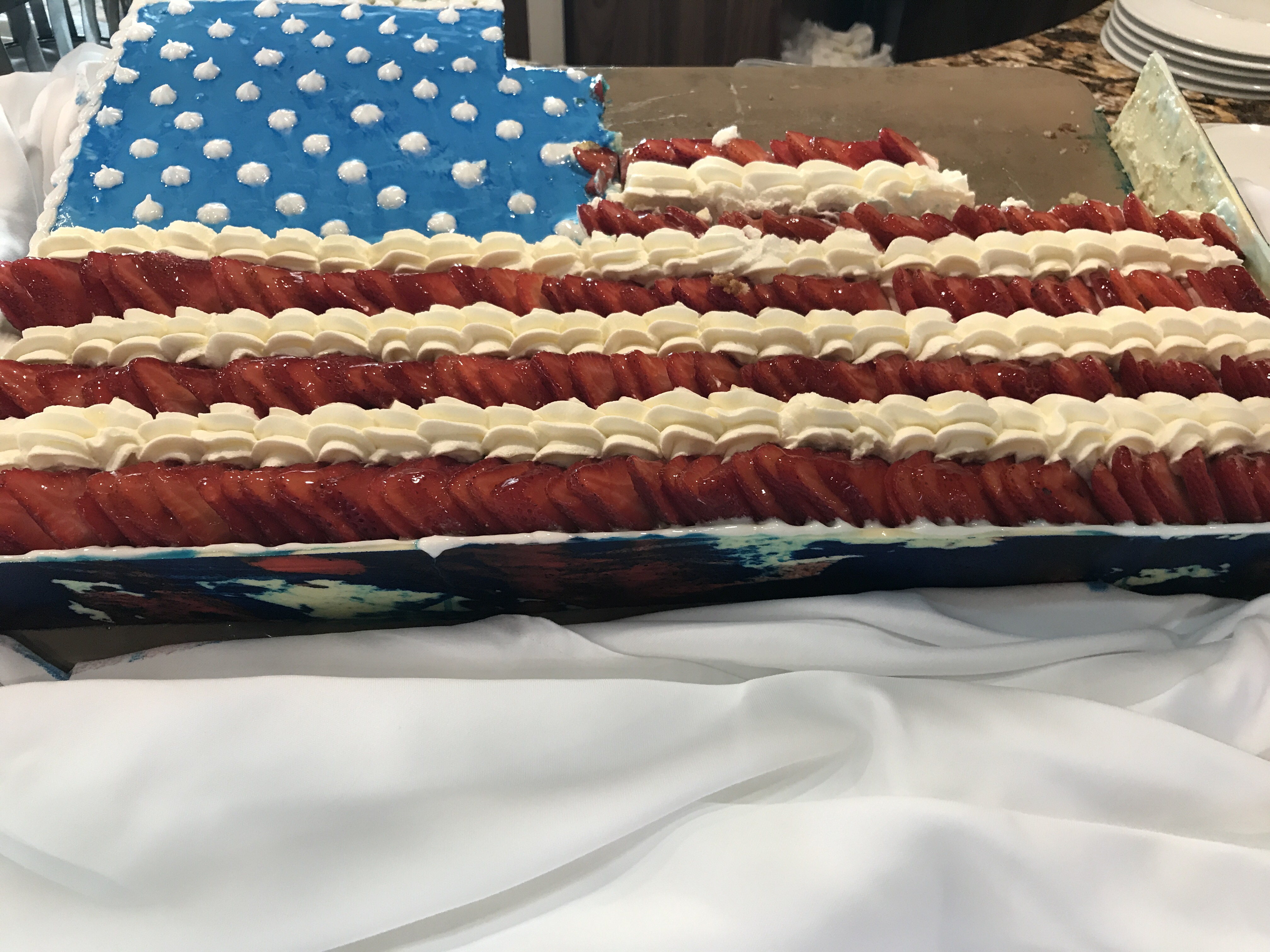 We had the usual July 4th food, corn on the cob, burgers, hot dogs, ribs, chicken, potato salad, etc.  Delicious.  And the pastry chefs made a flag cake too!
