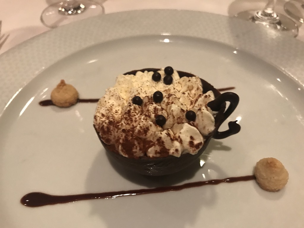 Last night we were invited to dinner with Thierry Tholon, the General Manager, and Alex Norton, the Oceania Ambassador. We had two other couples at our table, one from Australia and one from Vienna. We had a great time, a fun discussion and a dessert that I didn’t have on either world cruise but that Rudy, one of our tablemates, highly recommended. So I tried it and oh, my! It is called iced cappuccino parfait. Yes, that cup is made of pure chocolate. Yum.