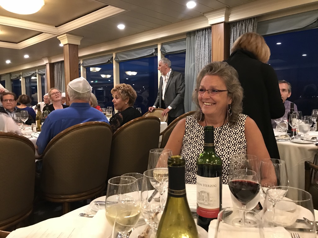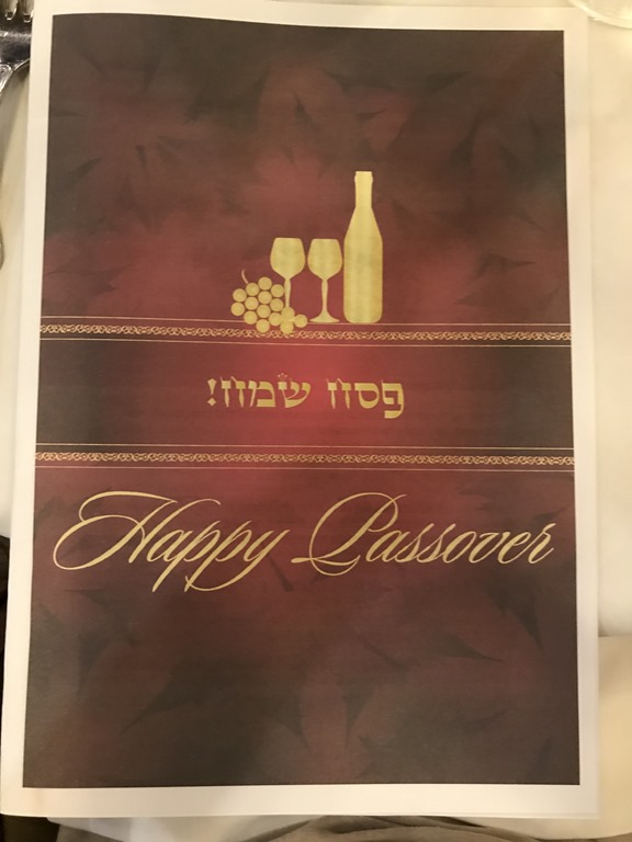 The Passover seder last night was well done! Tom did a great job organizing and running it. There were 104 people there, well over expectations. Quite a few weren’t Jewish but wanted to experience the seder. Here are our tablemates, the booklet with the service and the menu. The staff did a wonderful job. Tom said he averted a crisis when he found out that our Italian chef made special challah for us and they were sending out the baskets full. Normally on a Friday night they make it but he didn’t realize that at Passover you don’t eat it! I hope the other passengers and the crew got to enjoy it because it is delicious.