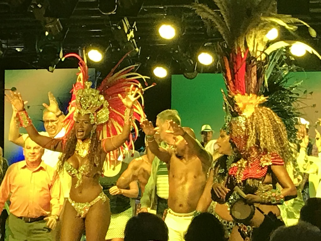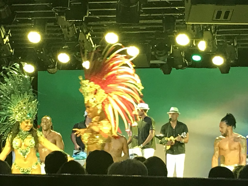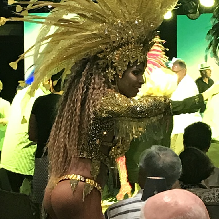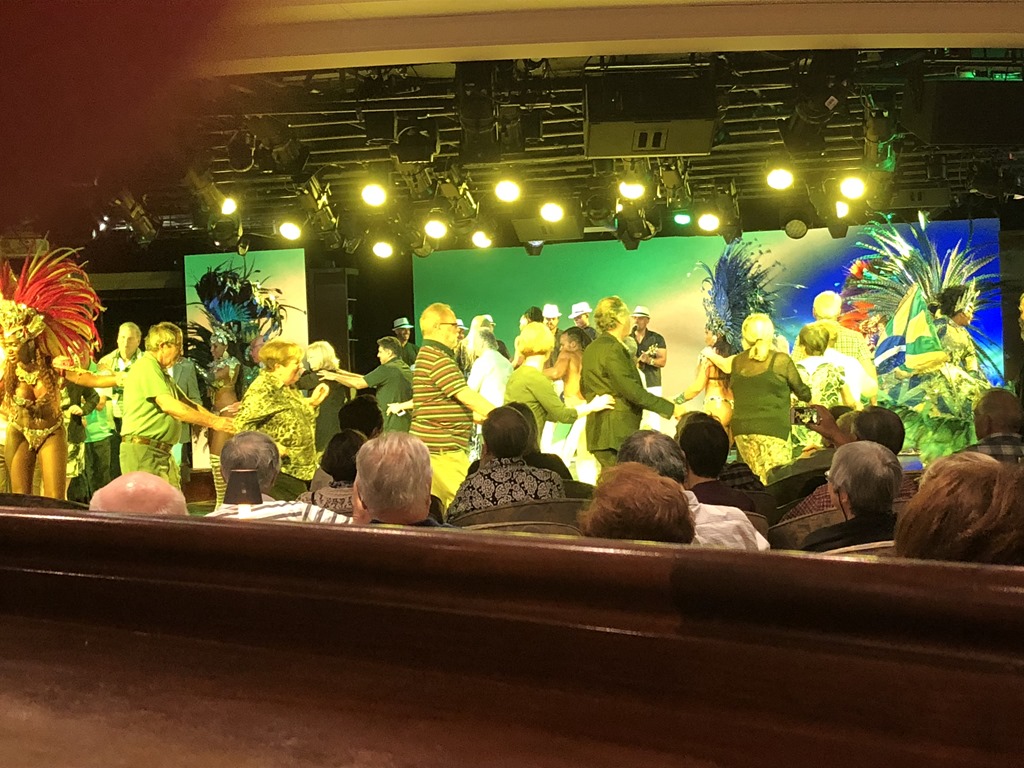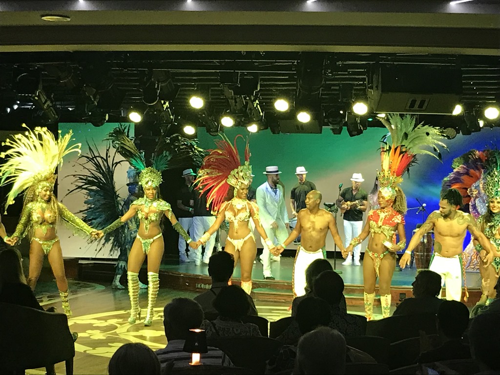 Our show tonight was a local music and dance troupe – Brasileirissimo. They put on a great performance which incorporated Samba, Gafieira and Capoeira plus a look at the world famous Carnival. It was amazing!! I do think all the women had breast implants, though. Not a jiggle among them and Nolan, our cruise director, said we would probably not see that much flesh in a long time. The pics aren’t great, wish I had video, but believe me, it was a great performance. They even got the crowd involved.