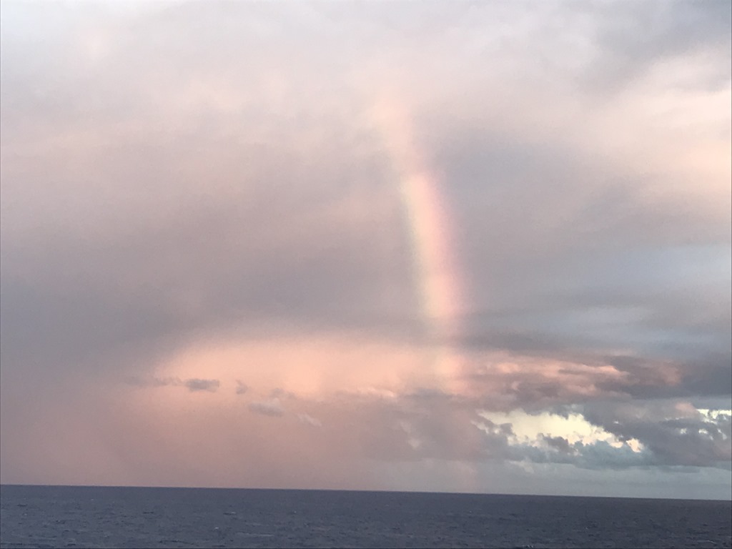 Yesterday there was a storm off our side of the ship – I could see it in the distance but we didn’t sail into it. I stayed and watched from our balcony. Here’s a picture of a small rainbow that appeared.