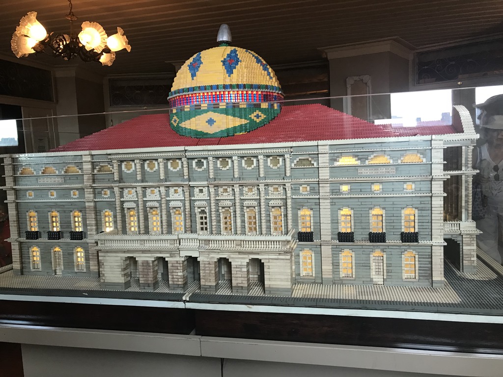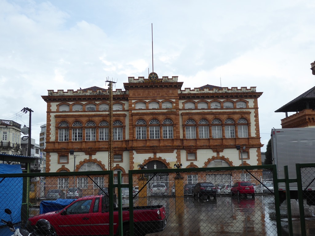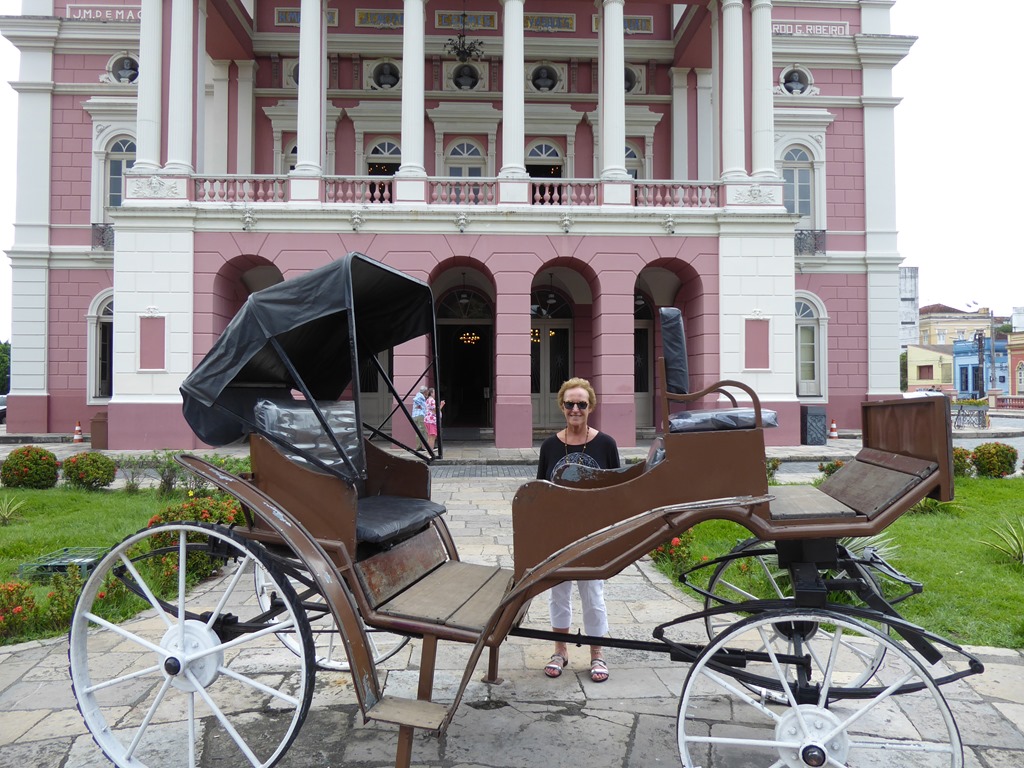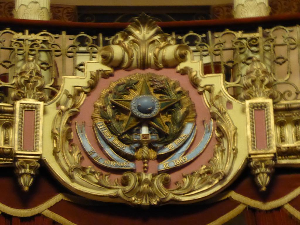 After our return to the pier, we had lunch and then went out to explore the city.  Gabriel warned us that it would rain, which it does every day here in this season, so I don’t know if he is much of a weatherman!  We did make it to the Opera House before it rained and we are so glad we did.  We had a guided tour and it is spectacular.  It is called Teatro Amazonas and has 670 seats.  It was constructed beginning in 1882 at the height of the rubber boom.  No expense was spared to make it the grandest opera house in the new world. Everything was brought from Europe. The wood is Brazilian but was sent to Europe to be polished and carved.  There are 22 marble columns in the auditorium, each topped by Greek masks fo comedy and tragedy and inscribed with the grandest names of music and literature such as Shakespeare, Beethoven, Mozart and Goethe.