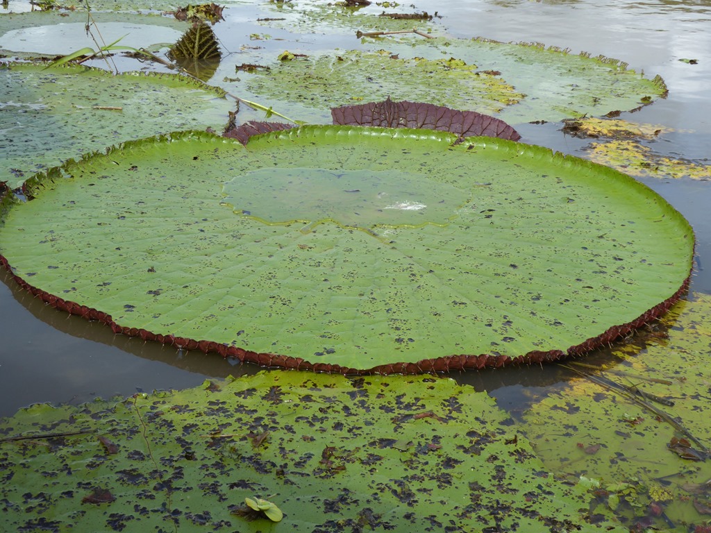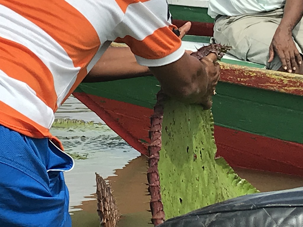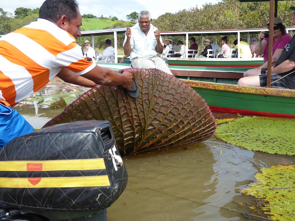 We left the riverboat at a riverside restaurant and boarded 10 passenger motorized canoes that took us into narrow channels in the tropical forest to Lake January. We saw the giant water liles, Vicgtoria Regia, named after Queen Victoria.  These plants have huge leaves measuring as much as 6 feet across – and there are spikes on the bottoms.