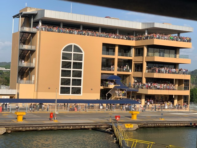 Pat, the building where all the people were is the Miraflores Locks Visitor Center. Those people were likely daytrippers or ship passengers on shore excursions. We did a tour in 2009 where we got off Coral Princess at Gatun Lake and proceeded to the VC as part of our tour. It was interesting to see the canal and ships in the locks from the ground level … which was allowed back then.